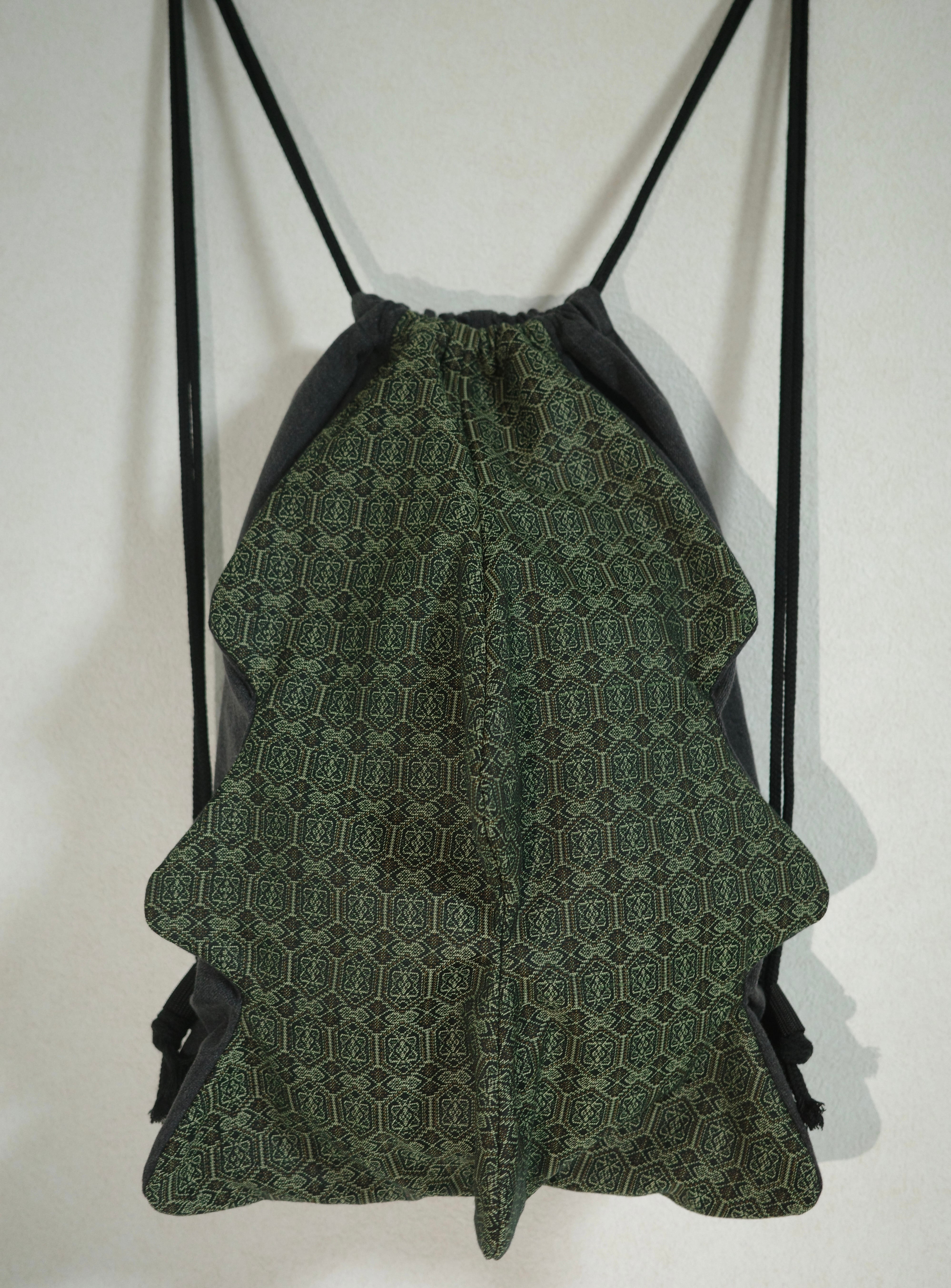 素材はデニムと着物地を使用しています。 ナップサックの中に物を入れることで形が綺麗に出ます。 内ポケットつき