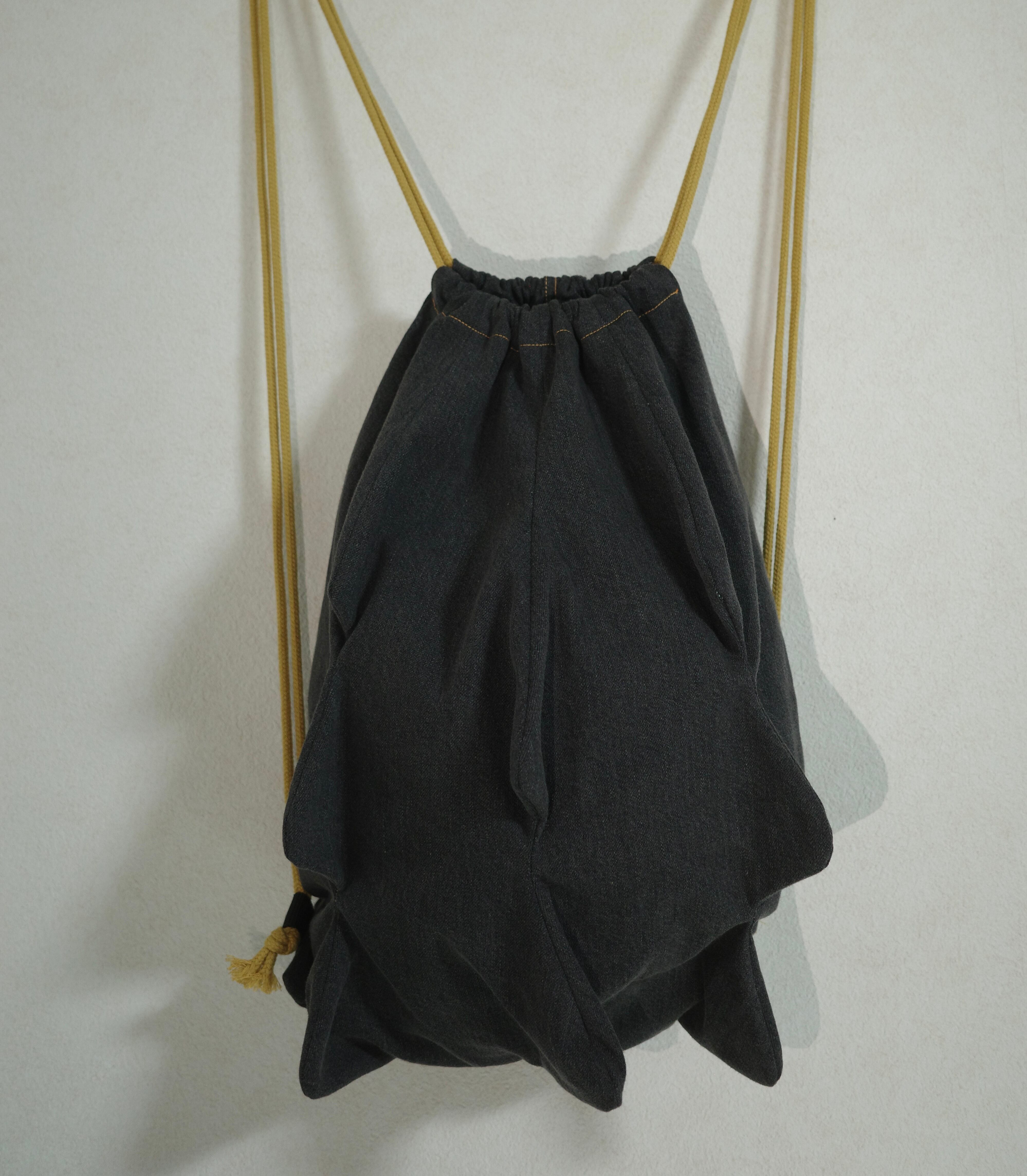 素材はデニムを使用しています。 ナップサックの中に物を入れることで形が綺麗に出ます。 外ポケット付き
